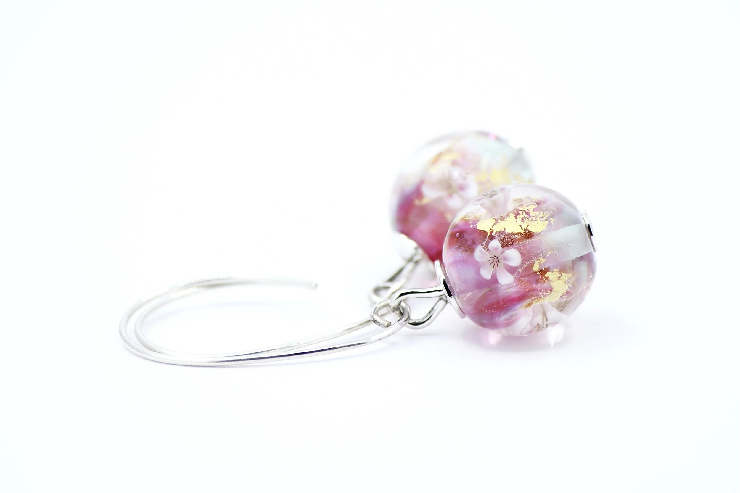 All flameworked glass beads and their components, including the little floral murrine (flowers), are hand made using traditional flameworking techniques, simple hand held tools and soft glass from Italy (Effetre), Germany (Reichenbach), and the USA (Double Helix). Each piece is then annealed in a kiln for strength and durability, and set into handcrafted sterling silver settings.
